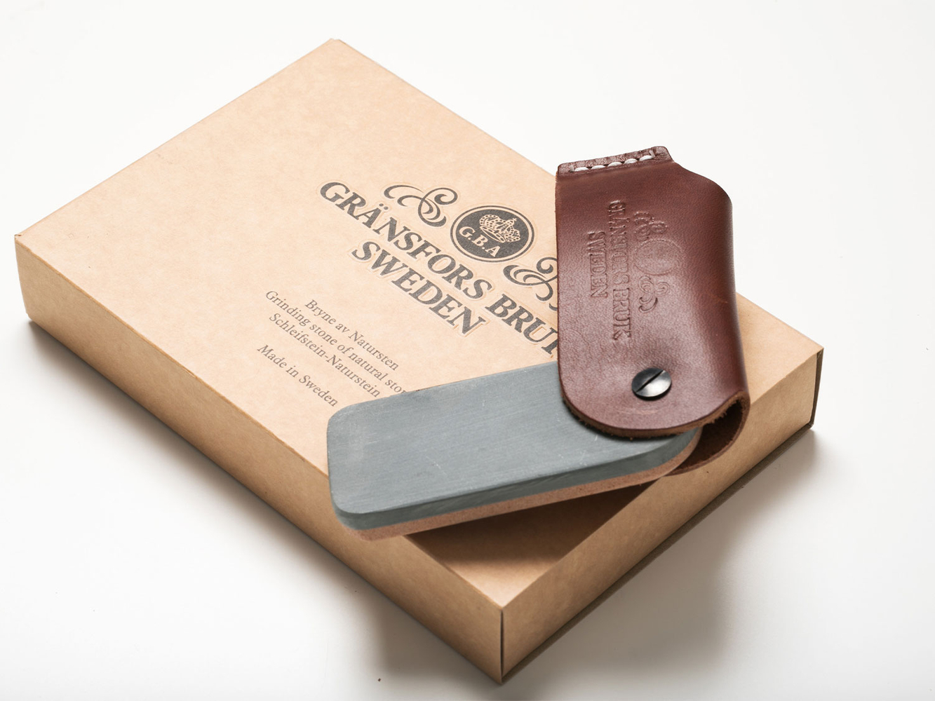 The whetstone’s shape is user-friendly and easy to hold with a firm grip. This makes it relatively simple to sharpen an edge by following the existing bevel and grind angle. The whetstone comes with a sheath of vegetable tanned leather from Tärnsjö Garveri in Sweden with a small strap for easy attachment to trousers or backpack, perfect for carrying in the wilderness.