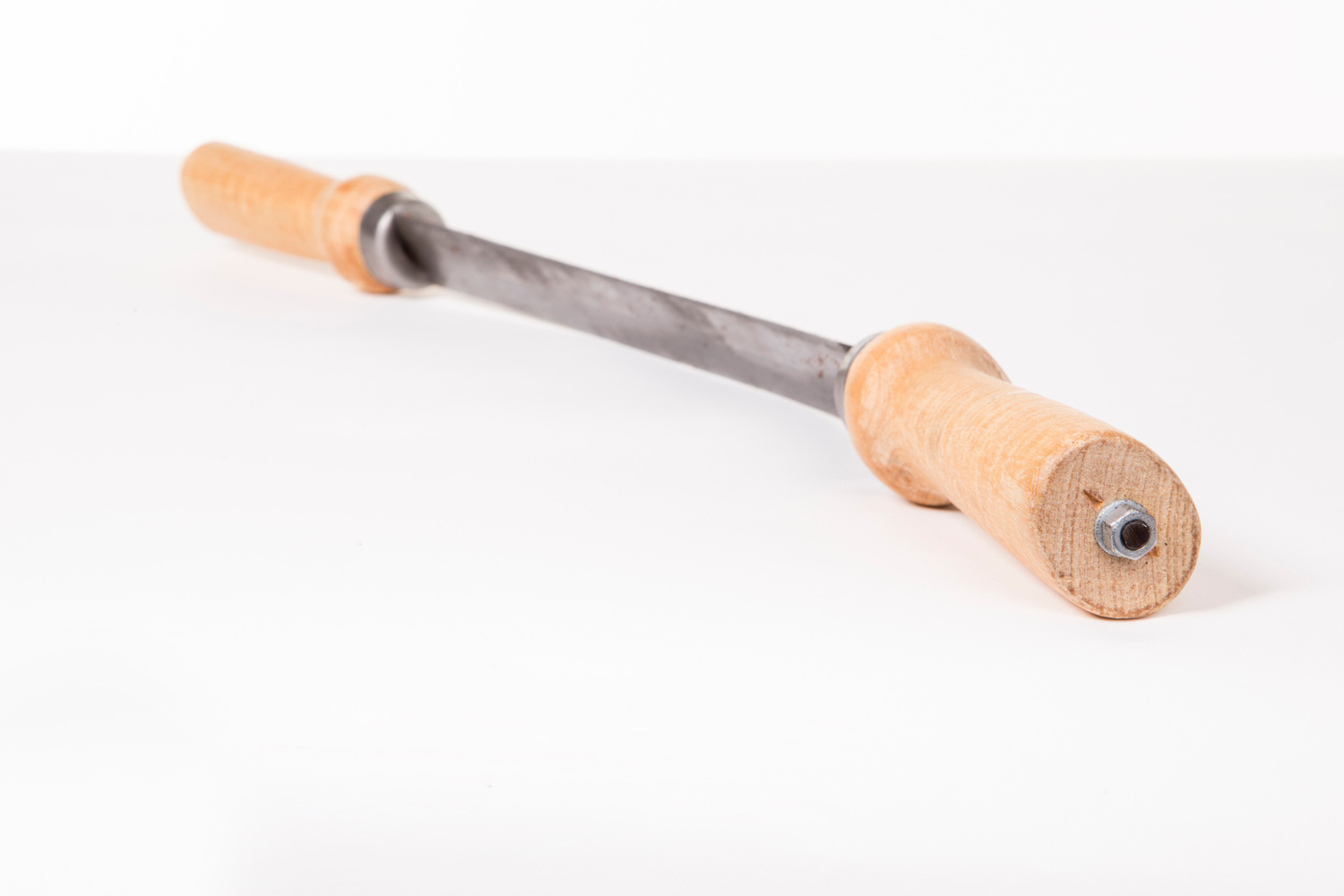 The protruding handles allow the user to get plenty of power behind each stroke. It is important to put your whole body into the action, rather than just using your arms. The knife glides over the timber, with the angle adjusted by hand for the desired planing effect. The Draw Knife can also be angled more sharply for more of a cutting action.
