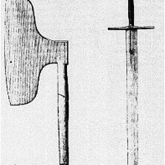 There were also large battle axes with a broad long head on a long handle. One example is the Bearded axe, which often had an elongated edge with a sabre-like curve called a beard. The lower part of the blade was fixed to the handle with a rivet. The handle was about 1.4 metres long. On some models, the front part of the axe blade was shaped into a hand guard. Bearded axes came in many varieties, with one or more points or hooks. The bearded axe is sometimes referred as the “half-moon”. Other names were “bardiche” and “halberd”. These axes were common in Western and Central Europe during parts of the 14th century, before becoming more widely used, particularly in Sweden and Eastern Europe.