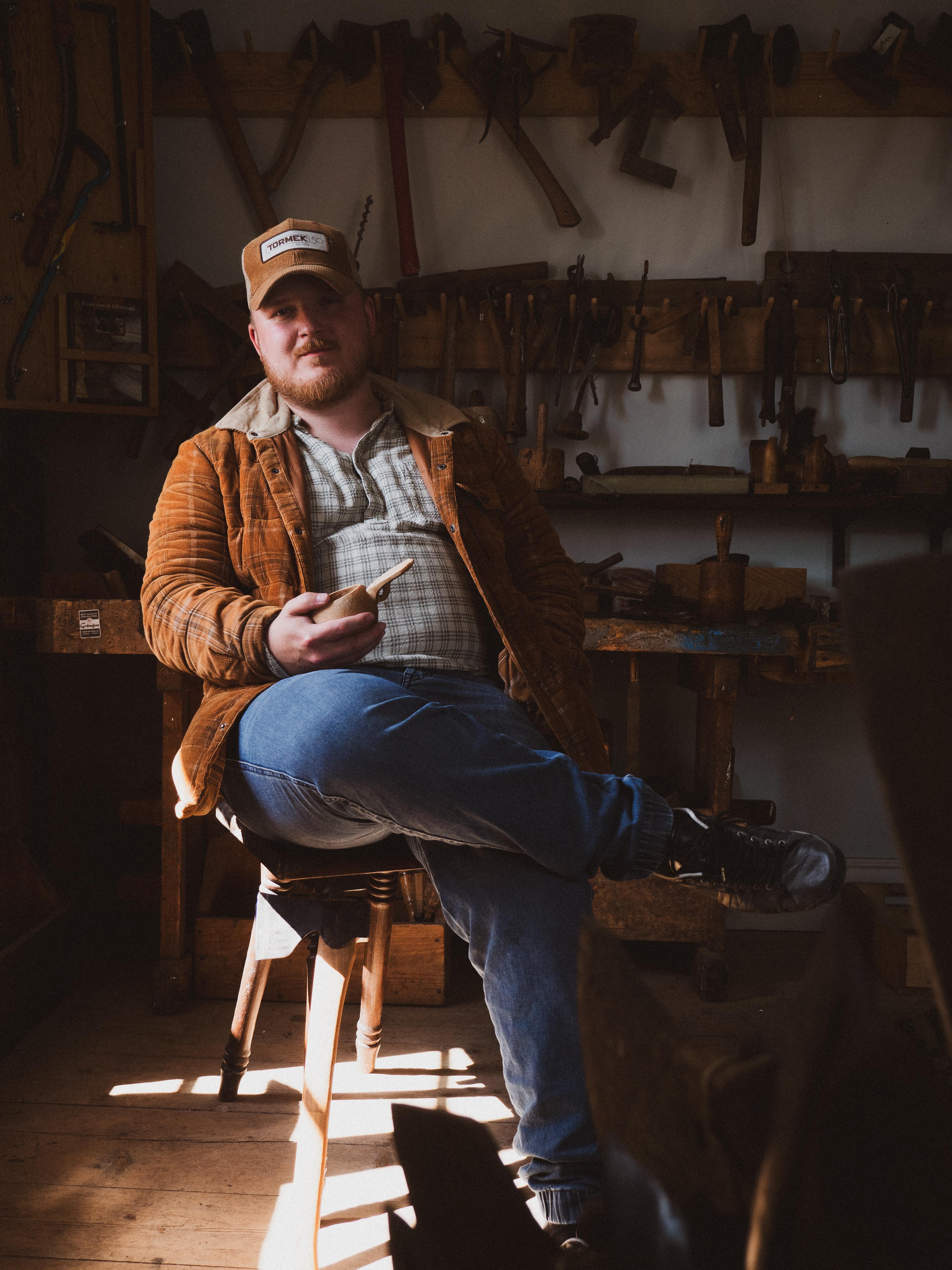 Many people dream of having the ability to express themselves through craftsmanship, art, or woodwork. Per Norén is one of those who has found expression, form, and joy. Living in an old schoolhouse in Raman, Hälsingland, Per discovered his purpose in woodcarving. Under the artist name Spångossen, he enchants thousands with beautiful images of meticulously detailed wood carvings. Some may envy his ability to create, but for Per, the meaningful part is making woodcarving accessible to everyone. We meet him during a spooncarving course outside the Axe Museum in Gränsfors.