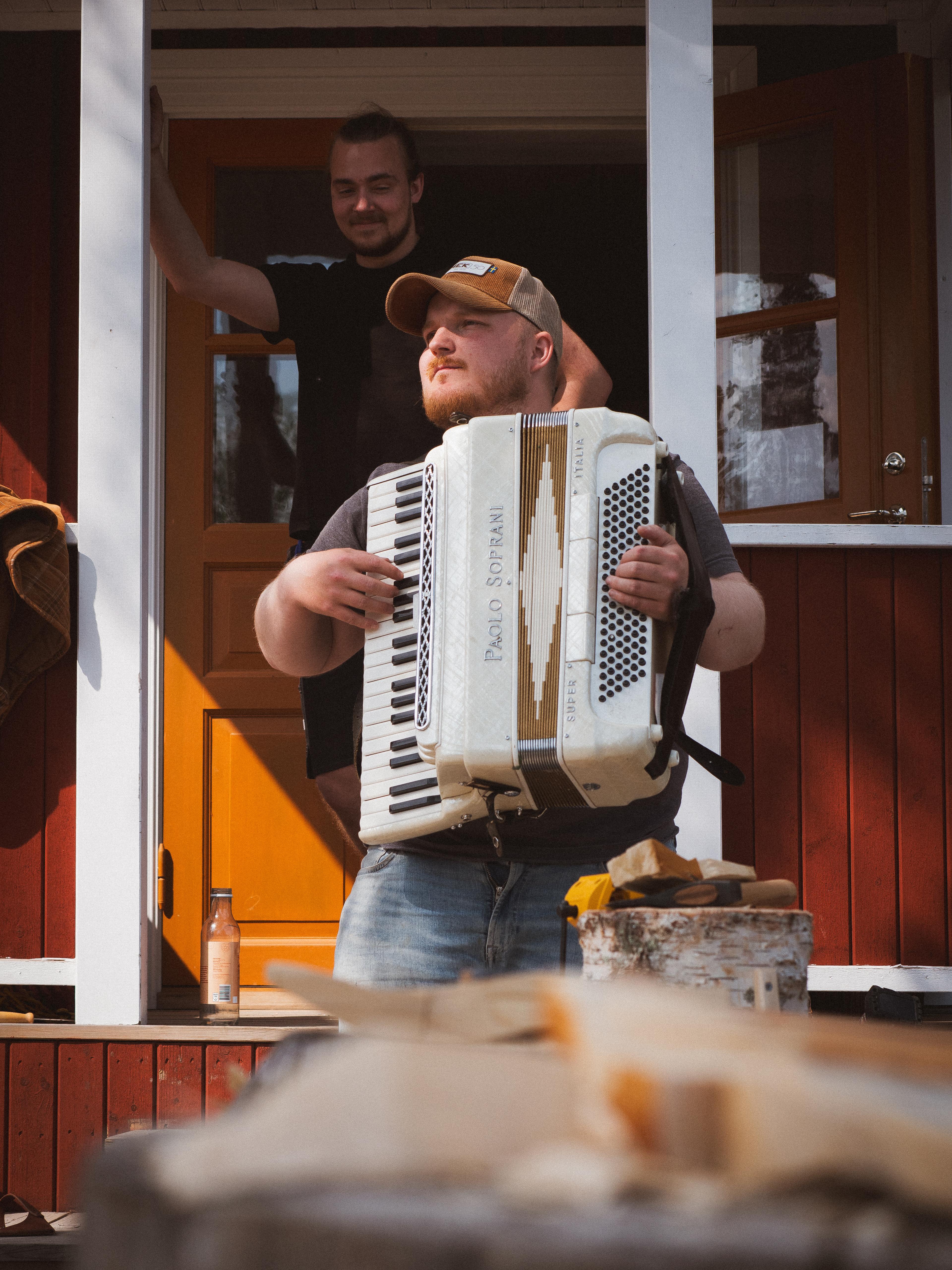 Shavings and splinters fall to the ground. The course participants continue working. Some with axes, now also some with knives. They share a common focus, a deep concentration on finding the spoon’s ergonomics. The silence is suddenly broken when Per brings out his accordion. The spring day in Gränsfors turns into a musical idyll.