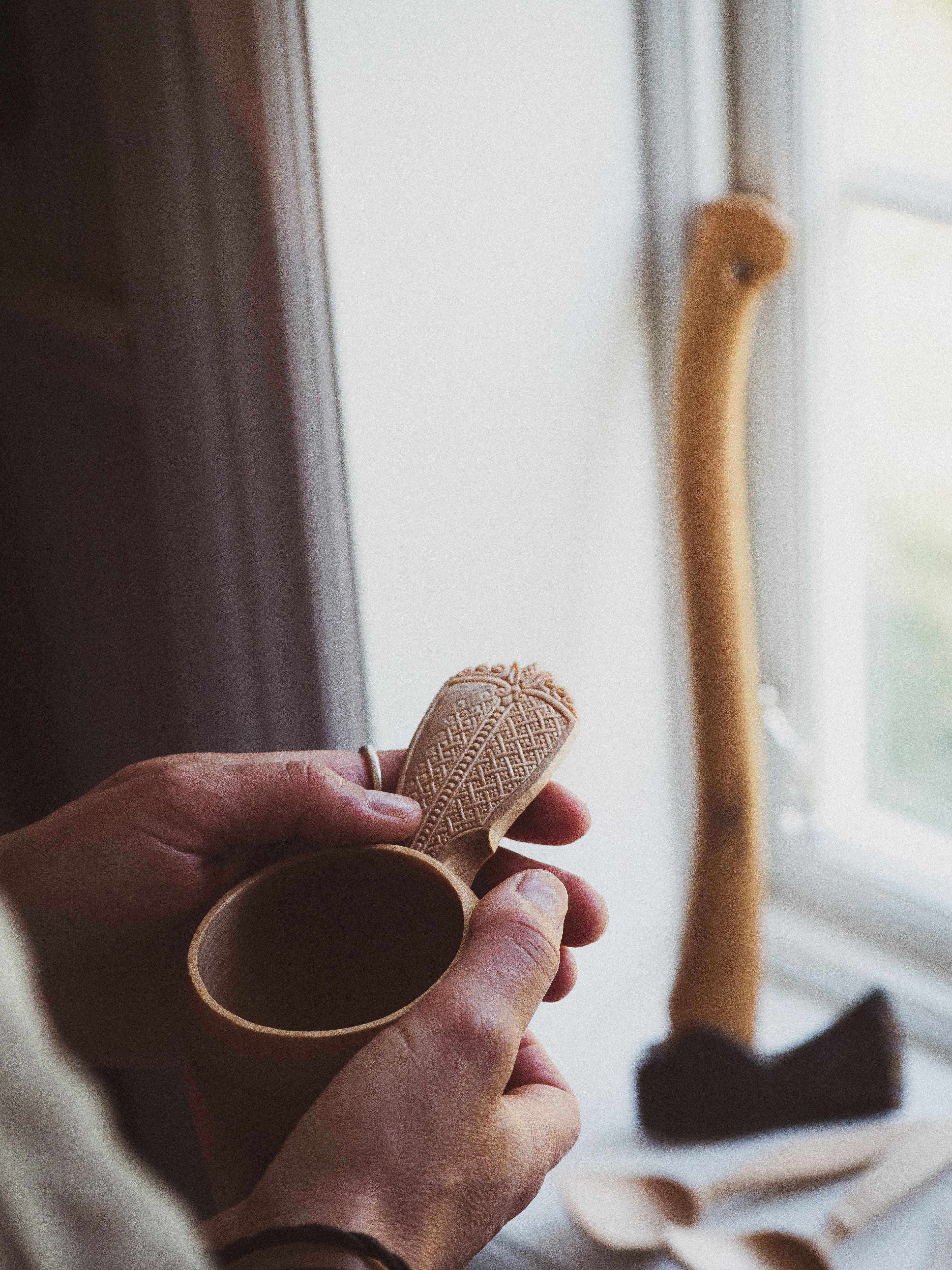 The course is concluded. Previously made spoons, a cup, and a pair of meticulously detailed shrink boxes emerge from Per’s bag and land on the windowsill in the Axe Museum. The light hits perfectly, presenting the carved surfaces in an enchanting way. Some of the creations are finished, others are in progress. Tiny pencil sketches are visible on the handle of the cup. It’s clear that the craft is allowed to take its time.